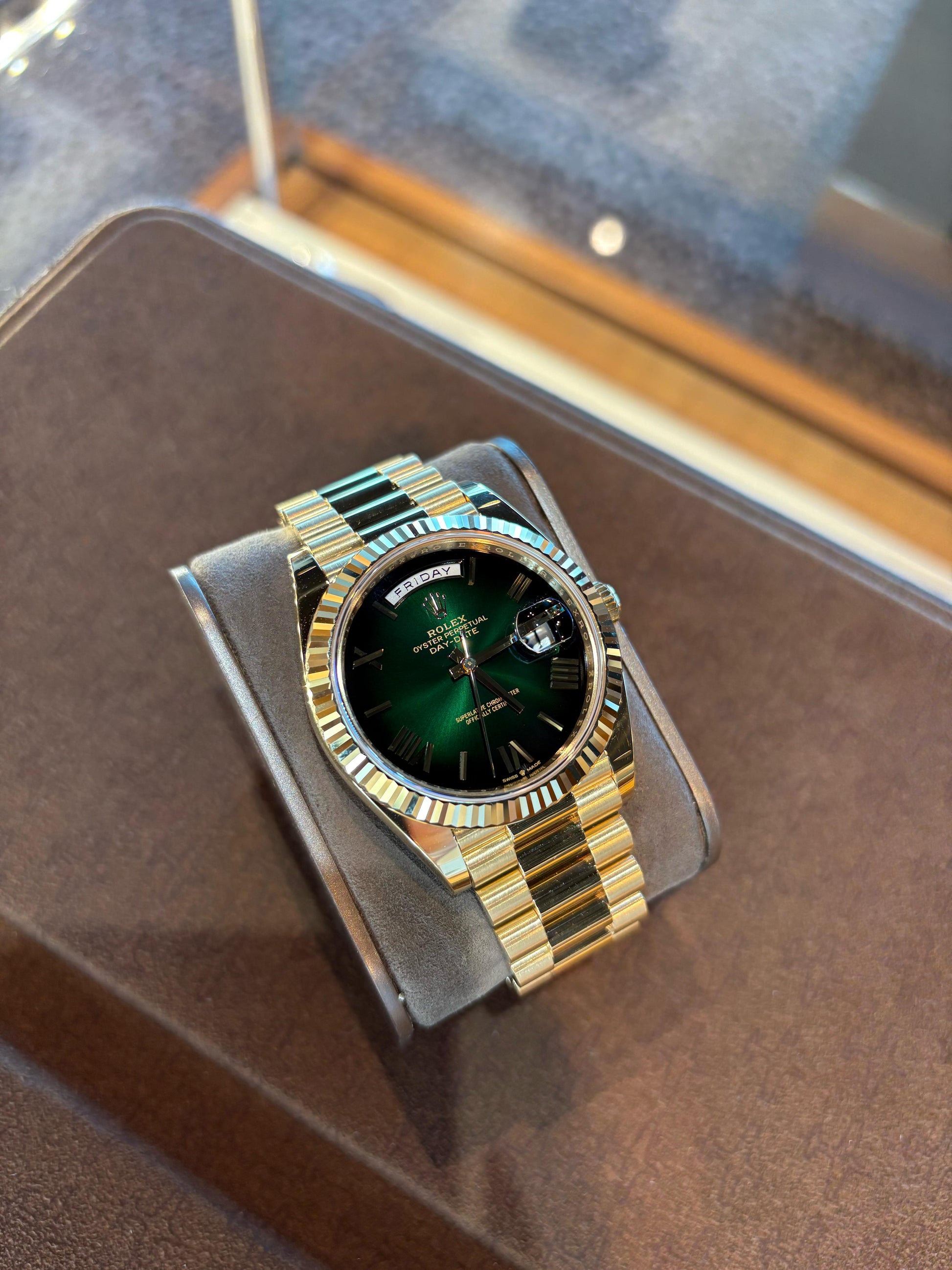 Rolex Day-Date 40 40mm Green Ombré Roman Dial Fluted Bezel President Bracelet - 228238 | 2025 Model