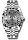 2025- 41mm white Rolesor case comprised of a 904L steel monobloc middle case, screw-down steel back, screw-down crown with twinlock double waterproofness system, 18K white gold fluted bezel, scratch-resistant double anti-reflective sapphire crystal with cyclops lens over the date, slate dial, green Roman numerals, Rolex calibre 3235 perpetual self-winding movement with date at 3 o'clock that changes instantaneously at midnight in a few thousandths of a second, approximately 70 hours of power reserve, 904L steel Jubilee bracelet with five-piece links, folding Oysterclasp buckle with Easylink 5mm comfort extension link. Waterproof to 100 meters.