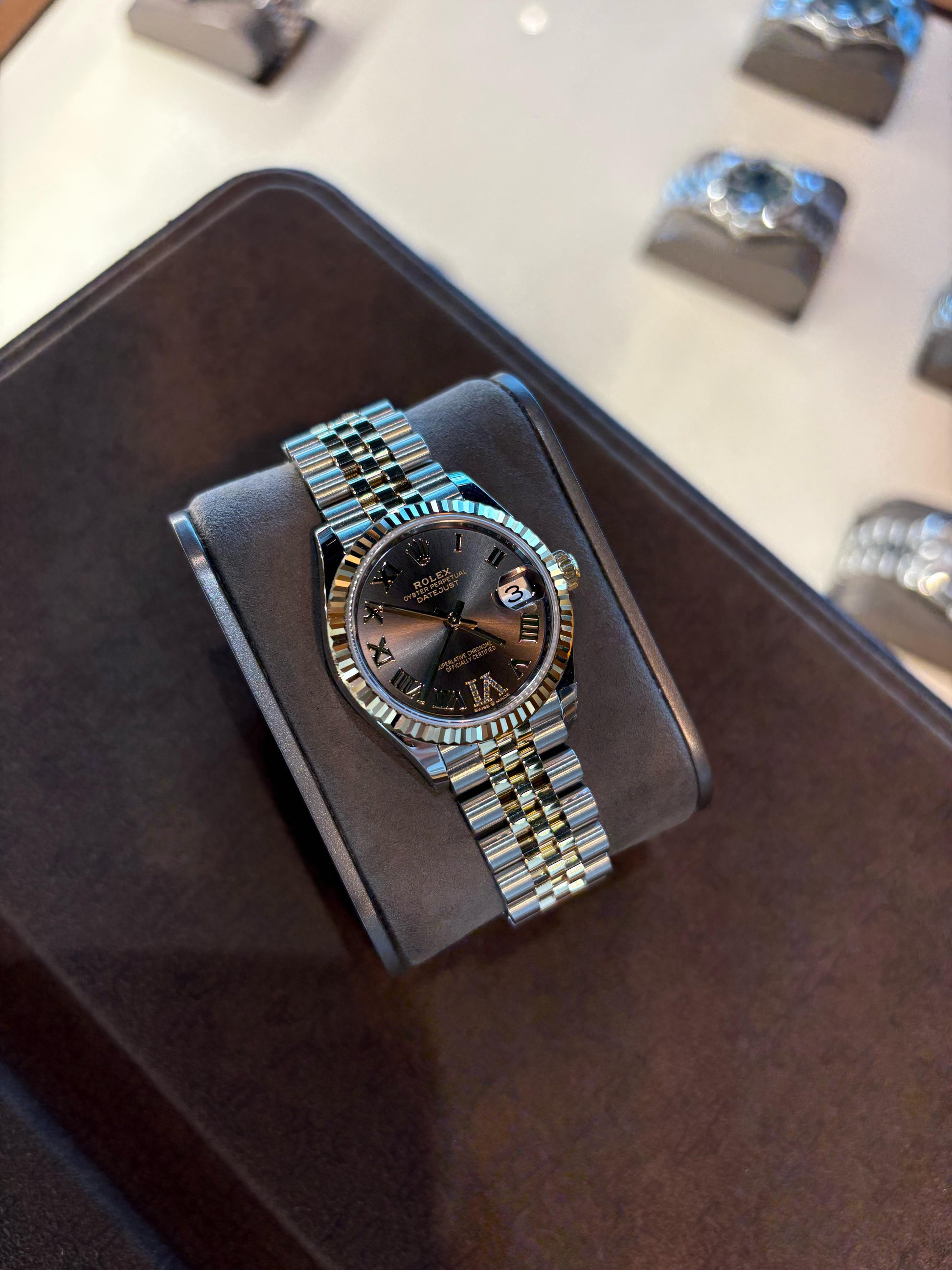 2025 - 31mm yellow Rolesor case comprised of Oystersteel and 18K yellow gold, screw-down back, screw-down crown with twinlock double waterproofness system, 18K yellow gold fluted bezel, scratch-resistant sapphire crystal with cyclops lens over the date, dark grey dial, Roman numerals with 11 diamonds set on VI, Rolex calibre 2236 perpetual self-winding movement with date at 3 o'clock, approximately 55 hours of power reserve, yellow Rolesor Jubilee bracelet with semi-circular three-piece links, concealed folding Crownclasp buckle. Waterproof to 100 meters. Complete with Box and Paper.