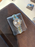 2025 - 28mm yellow Rolesor case comprised of a 904L steel monobloc middle case, screw-down steel back, 18K yellow gold screw-down crown with twinlock double waterproofness system, 18K yellow gold diamond bezel, scratch-resistant sapphire crystal with cyclops lens over the date and double anti-reflective coating, silver dial, diamond hour markers, Rolex calibre 2236 automatic movement with center hour, minute and seconds hands, instantaneous date with rapid setting, and stop-seconds for precise time setting, yellow gold Rolesor Jubilee bracelet comprised of a combination of 904L steel and 18K yellow gold in five-piece links, concealed folding Crownclasp buckle. Waterproof to 100 meters. Complete with an Box and Paper.