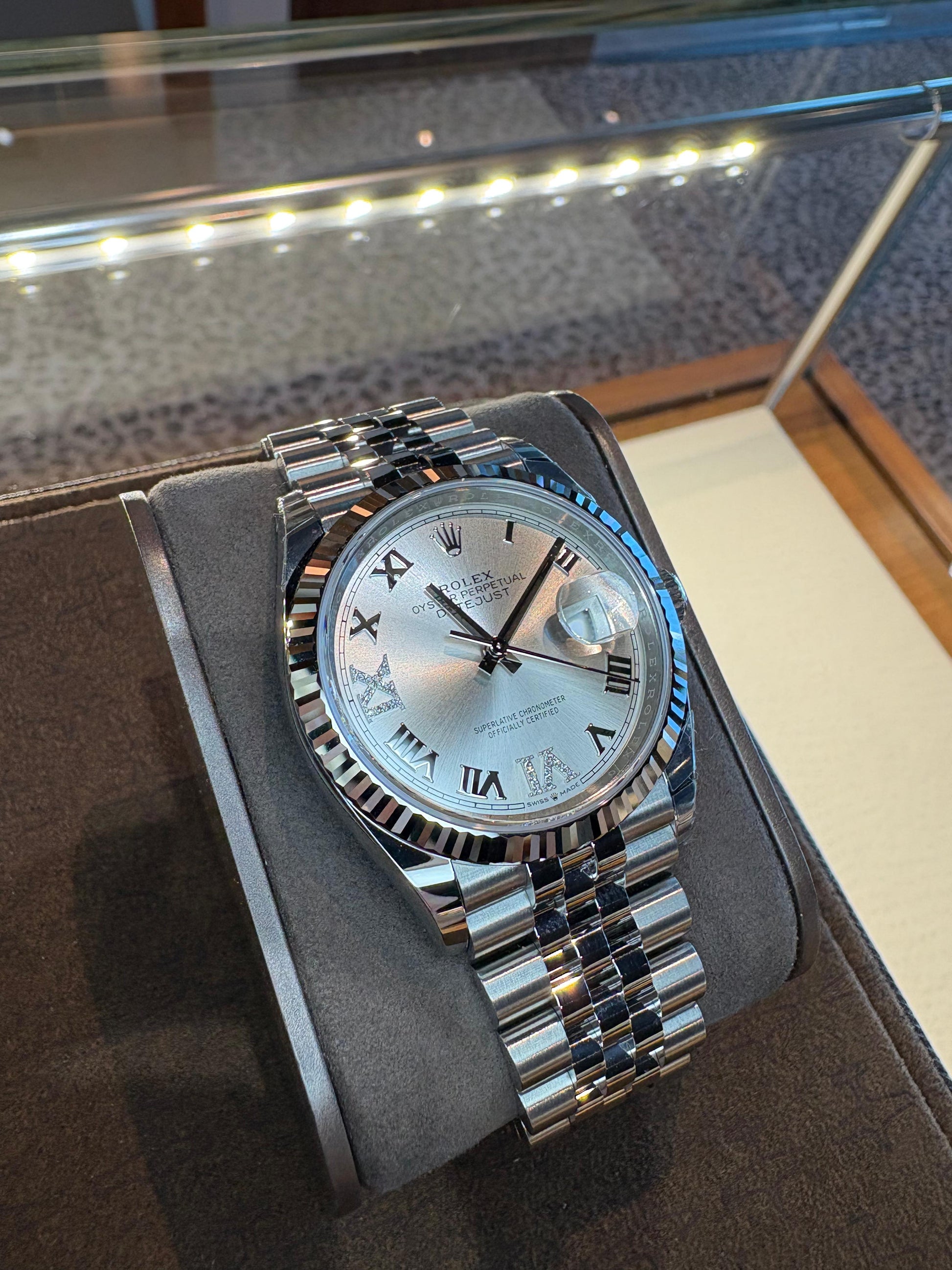 36mm Oystersteel case, screw-down steel back, screw-down crown with twinlock double waterproofness system, fluted bezel, scratch-resistant sapphire crystal with cyclops lens over the date, silver dial, Roman numerals with diamond set 6 and 9, Rolex calibre 3235 perpetual self-winding movement with center hour, minute and seconds hands, instantaneous date at 3 o'clock with rapid setting, and stop-seconds for precise time setting, approximately 70 hours of power reserve, Jubilee bracelet with five-piece links, folding Oysterclasp buckle with Easylink 5mm comfort extension link. Waterproof to 100 meters. Baselworld 2024 release. Comes With Box and Paper!